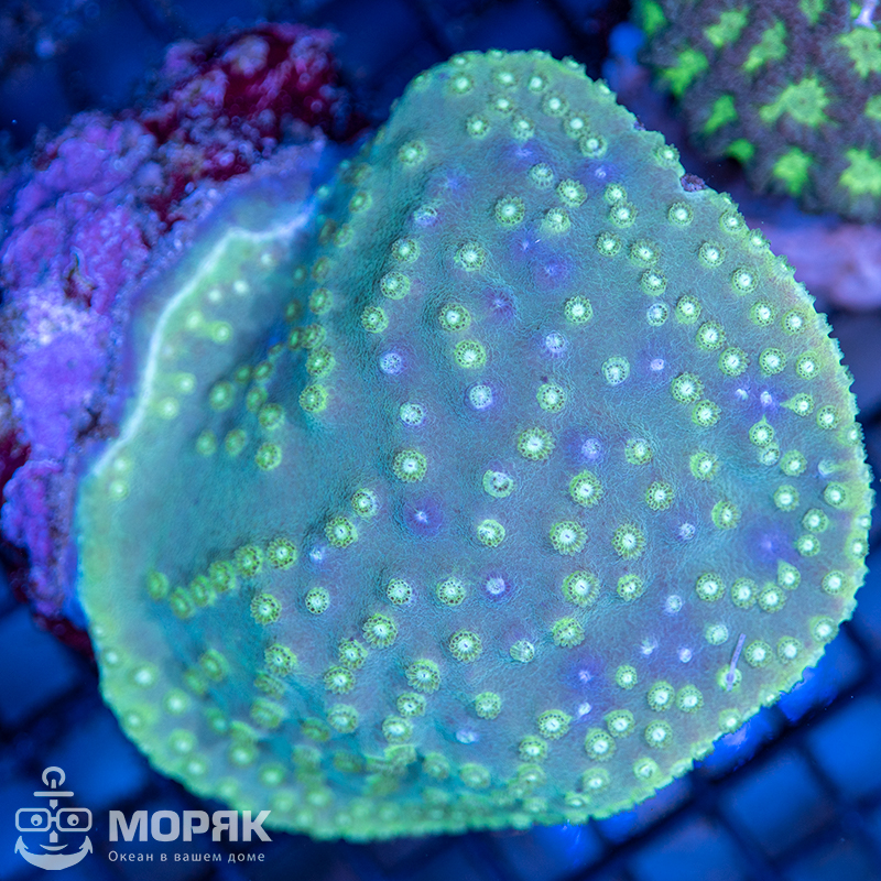 Салатовая турбинария ярко-флюрисцентная, диаметр коралла около 12 см.