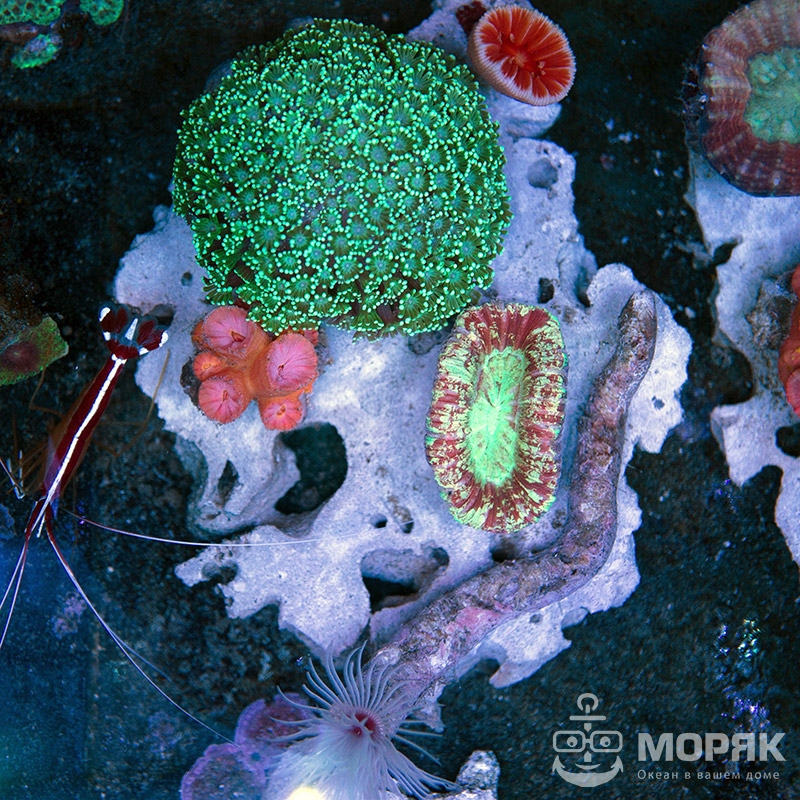 Набор из пяти кораллов на одном плаге. Все фраги легко снимаются с основного камня. Идеальный вариант для заселения небольшого аквариума различными по цвету кораллами.
