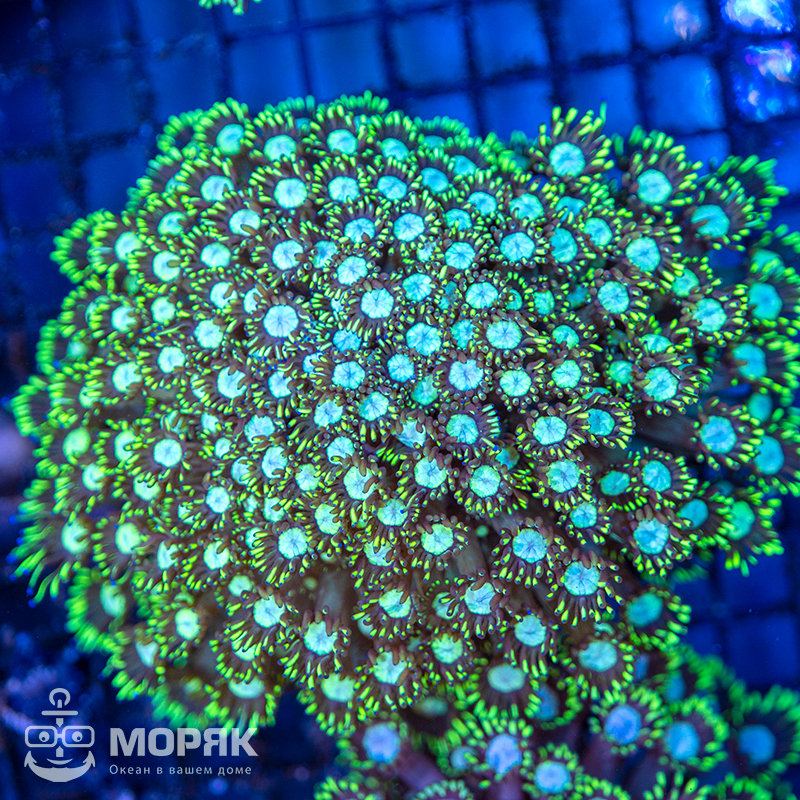 Гониопора с салатовыми полипами. В открытом виде диаметр коралла не менее 9 см. Соцветия флуорисцентны.