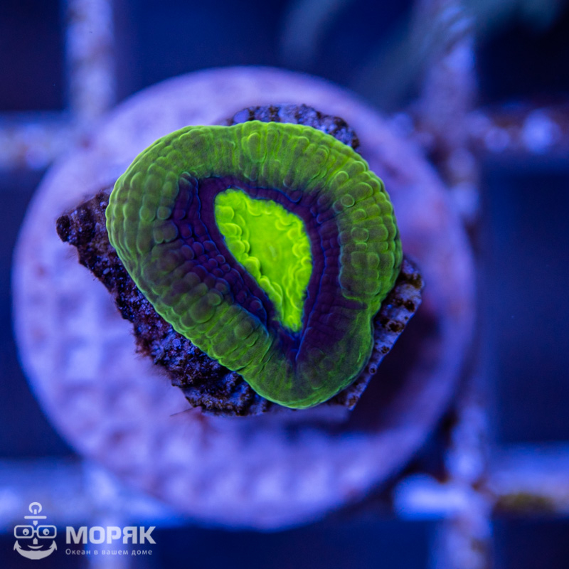 Фавия салатово-бордовая. Оба цвета флуорисцентны. Диаметр фрага 2 см