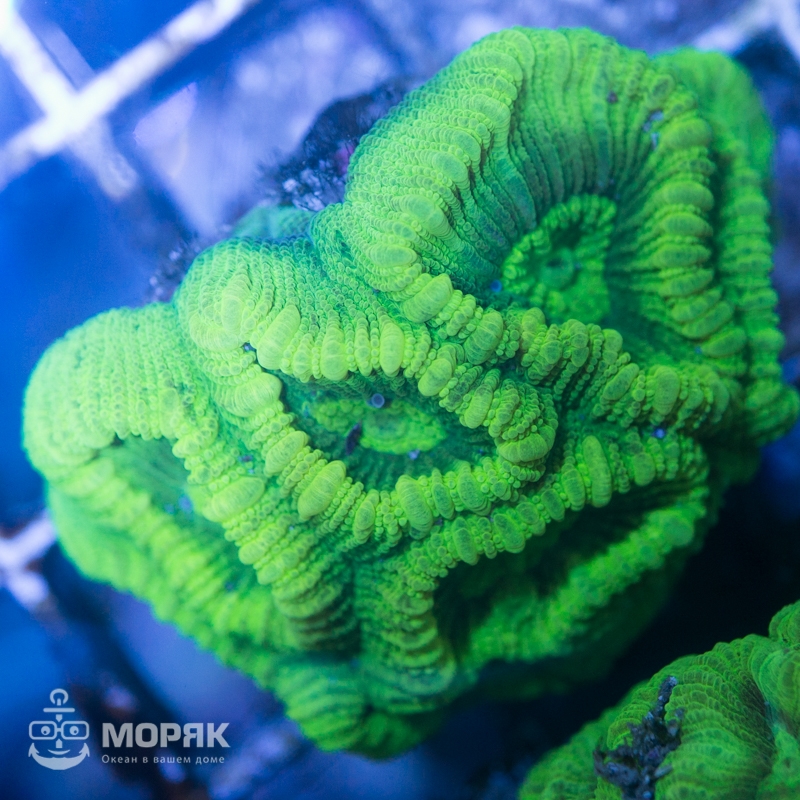 Зеленая флуорисцентная гониастрея (мозговик), фраг около 5 см в диаметре