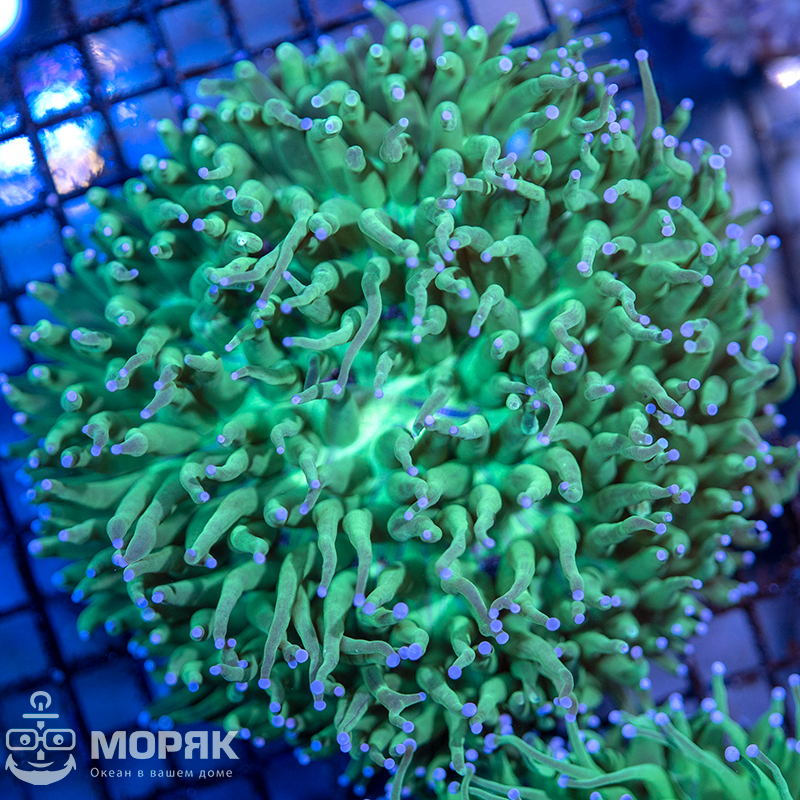 Гелиофунгия салатовая, флуоресцентная с голубыми флуорисцентными полипами. Диаметр коралла около 13 см. Очень красивый коралл.