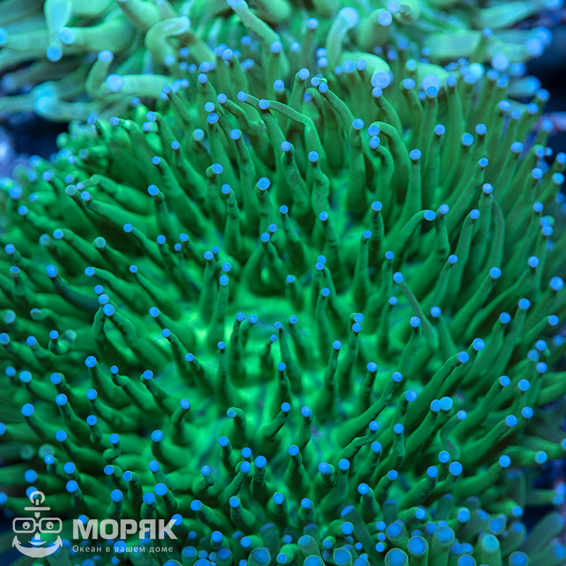 Гелиофунгия зеленая, флуоресцентная. Диаметр коралла около 12 см