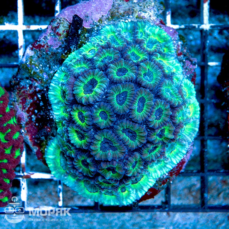 Синяя гониастрея с салатовыми вставками. Диаметр коралла около 7 см.
