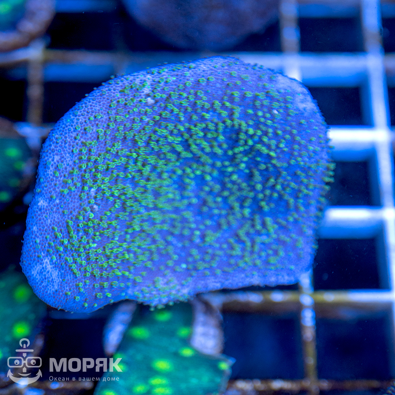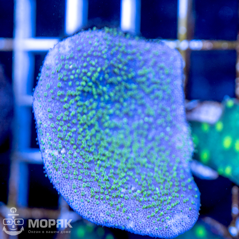 Диаметр коралла около 7 см, полипы ярко флуорисцентны