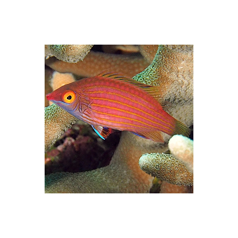 Абсолютно идентичный по содержанию и питанию вид с шестиполосым губаном-пижамой. Основное отличие этого губана в окрасе: вместо синих полосок, как у пижамы, у него присутствуют розовые полоски в сочетании с красными.