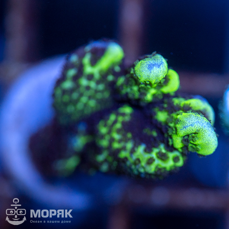 Фраг зеленой монтипоры конфузы высотой около 4 см. Очень красивый коралл вживую.